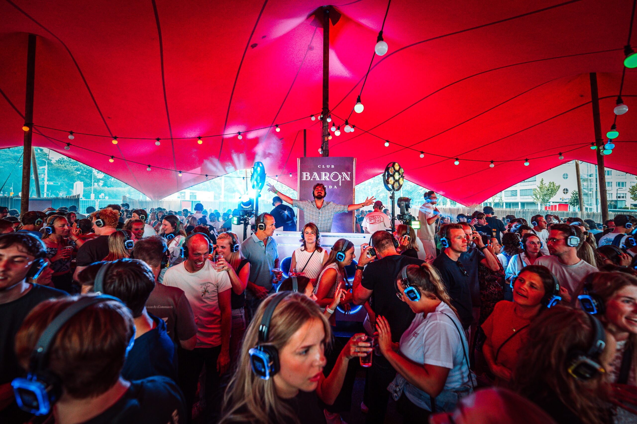 Naast techniek en muziek besteden wij veel aandacht aan de uitstraling van de area. Wij kleden onze area’s thematisch aan, passend bij het festival, het event of het gekozen concept. Zo wordt de silent disco niet alleen functioneel, maar ook visueel een sterke toevoeging aan het terrein.